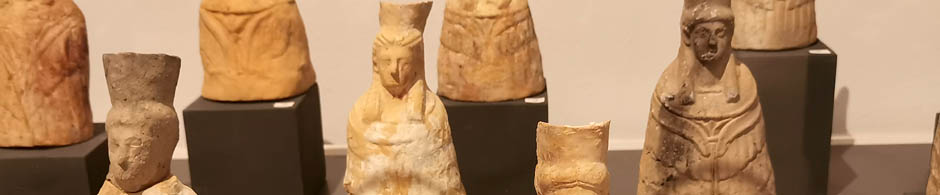 Ofrendas procedentes de Es Culleram. Entre los materiales arqeológicos encontrados en la cueva aparecieron varios tipos de terracotas (bustos, oferentes con velo, ebeteros, figuras con antorcha y animales, etc.), pero, entre todos ellos destacan las figuras acampanadas utilizadas como exvotos a la diosa Tinnit. |