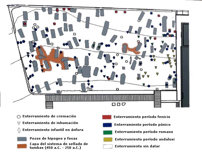 Durante la segunda mitad del siglo V y primer cuarto del IV a.C., la población de la isla había aumentado con nuevos aportes de gentes púnicas; por otra parte, la evolución social determinó una democratización del acceso al Mas Allá, de modo que toda la ciudadanía tenía derecho a una sepultura. El cementerio inicial fue sistemáticamente ocupado por las nuevas sepulturas púnicas, que se superpusieron o fragmentaron las antiguas tumbas fenicias. Los enterramientos de cremación son minoritarios a finales del siglo V a.C. e inicios del siglo IV a.C. |