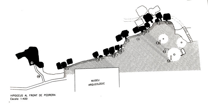 Los enterramientos visibles corresponden a la zona ya excavada, pero toda la explanada exterior del museo —como el resto del yacimiento— se encuentra completamente horadada de hipogeos y fosas. Por tanto, los enterramientos existentes, como muestra el plano a nivel de subsuelo, son muchos más de los que el visitante tiene a la vista. |