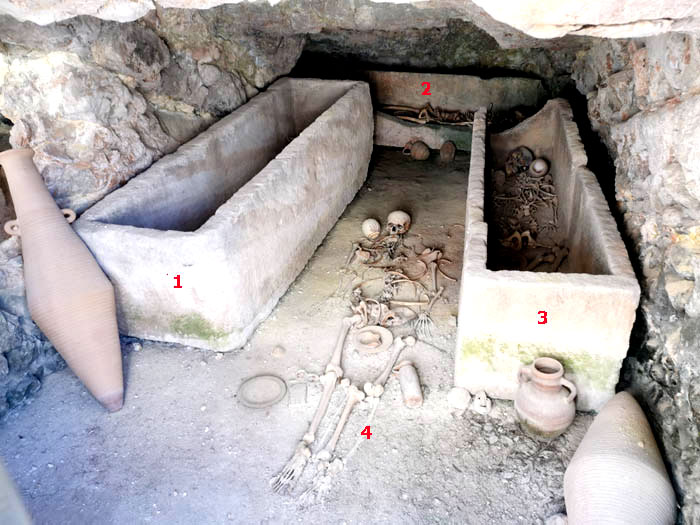 Desde finales del siglo IV a.C. dejan de abrirse nuevos hipogeos y muchos de los ya existentes se reutilizan durante este periodo a modo de panteón u osario. Sin embargo, se va generalizando el uso de fosas simples, a veces excavadas en la roca o abiertas en la tierra. Aunque la inhumación sigue siendo mayoritaria, se detecta la presencia de algunos enterramientos de cremación. |